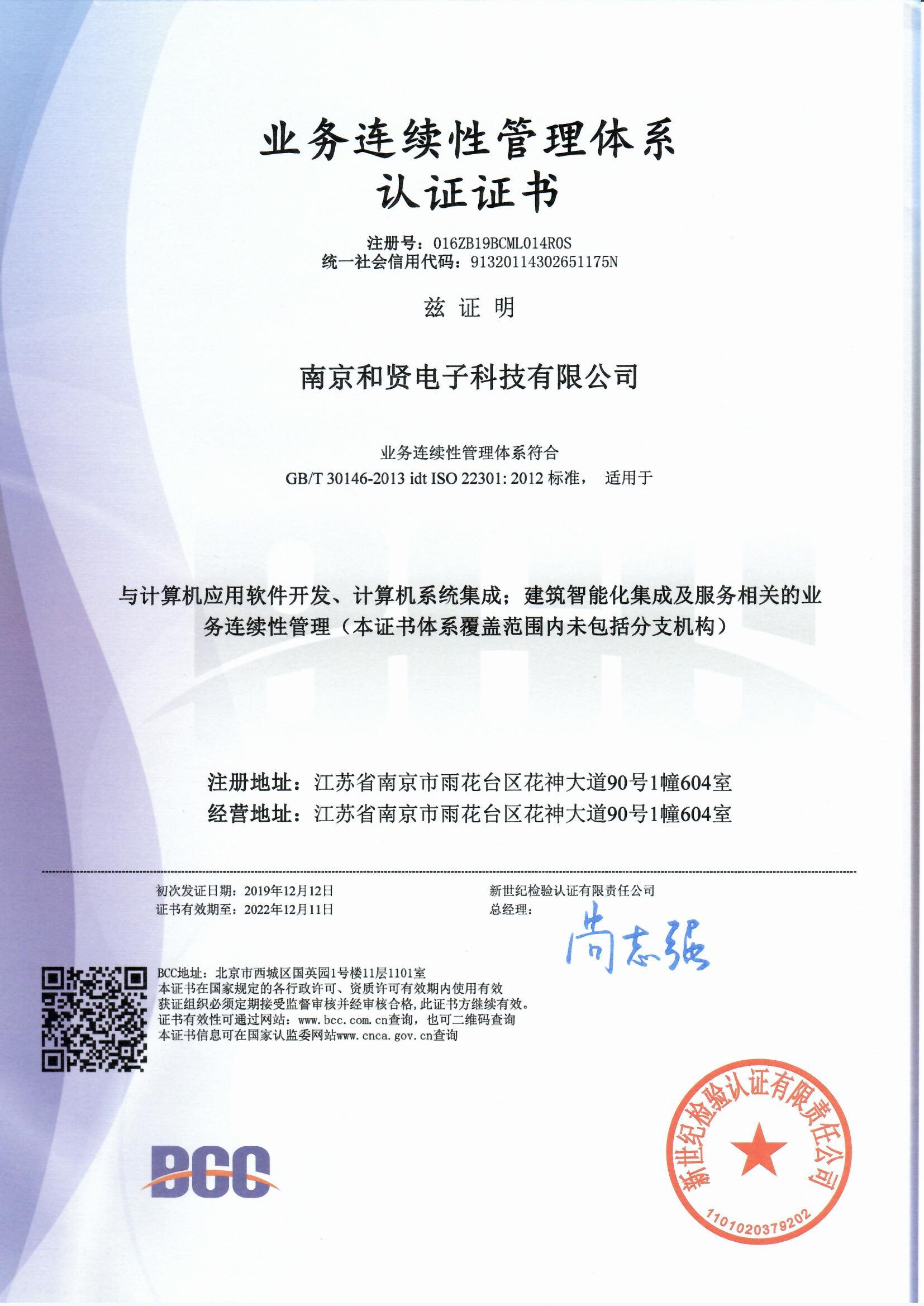 ISO22301业务连续证书 2019年11月